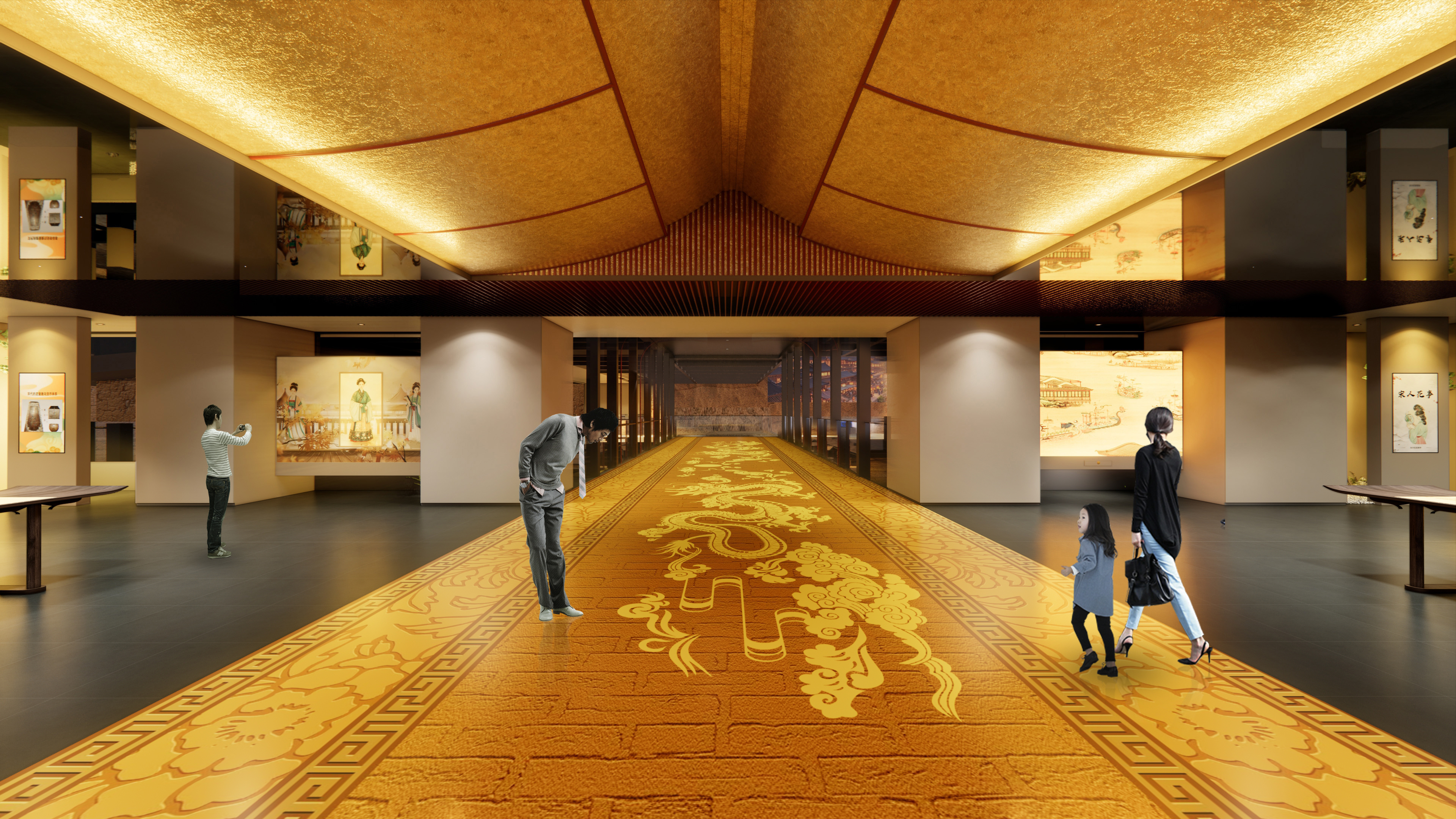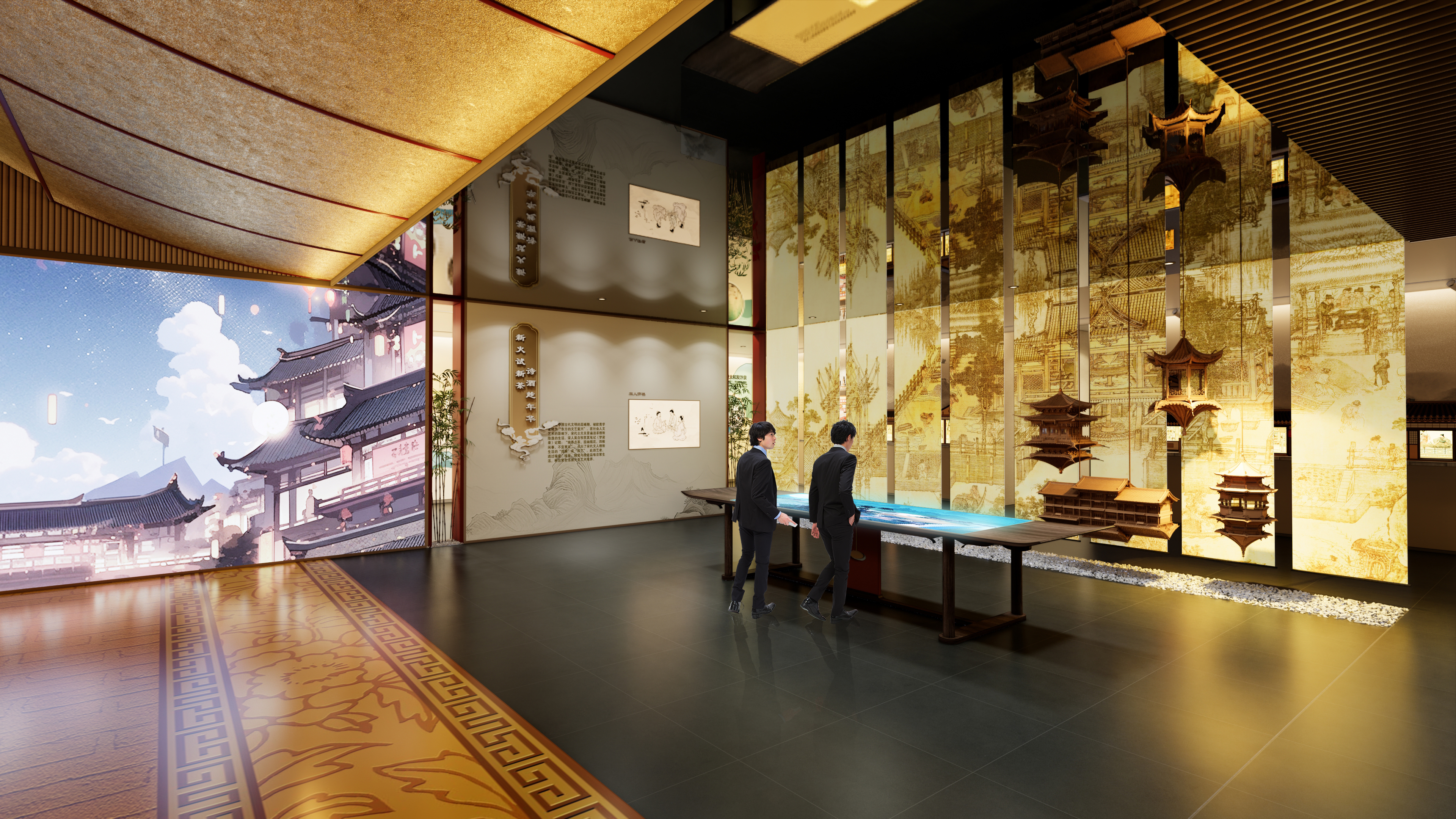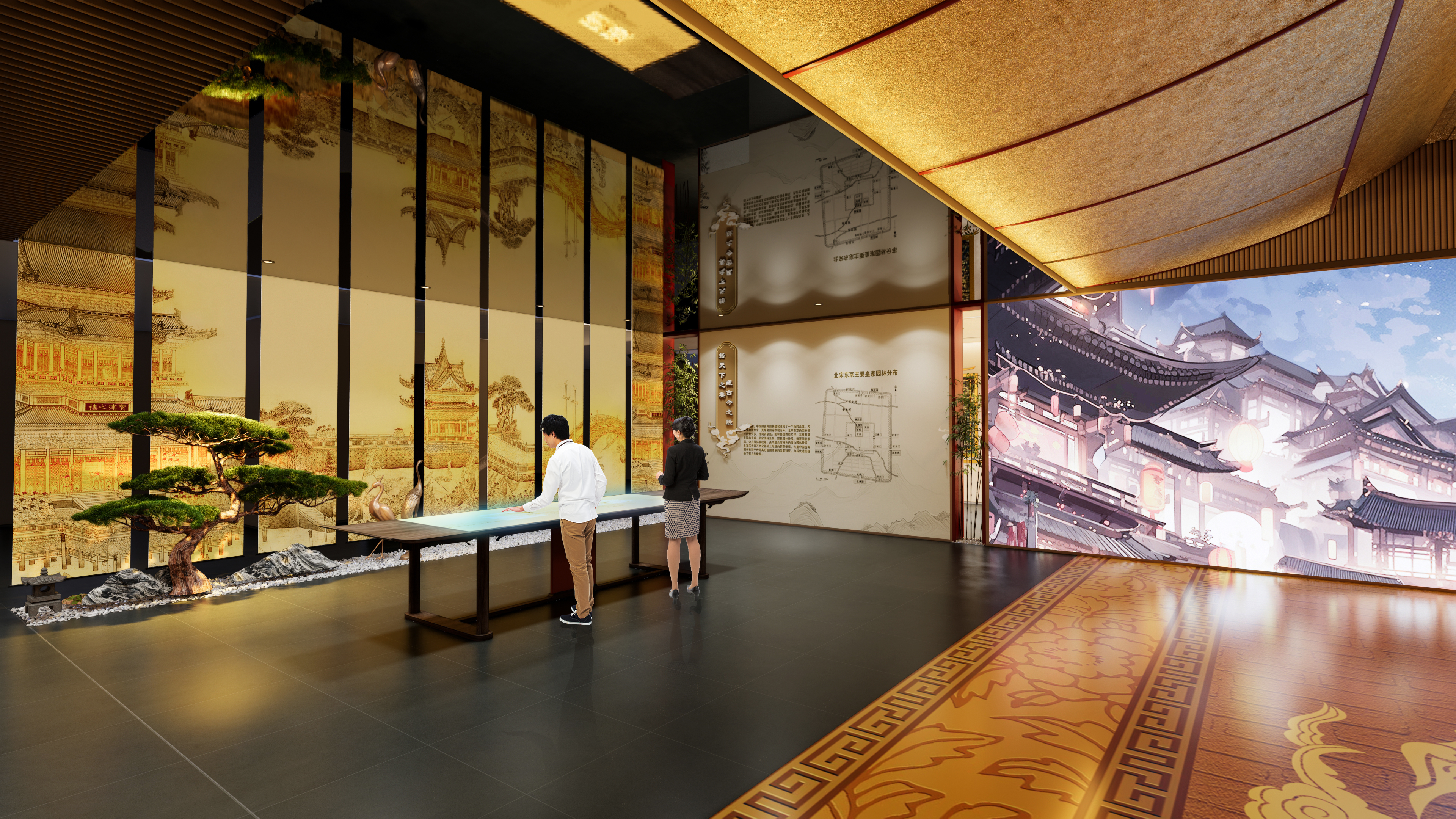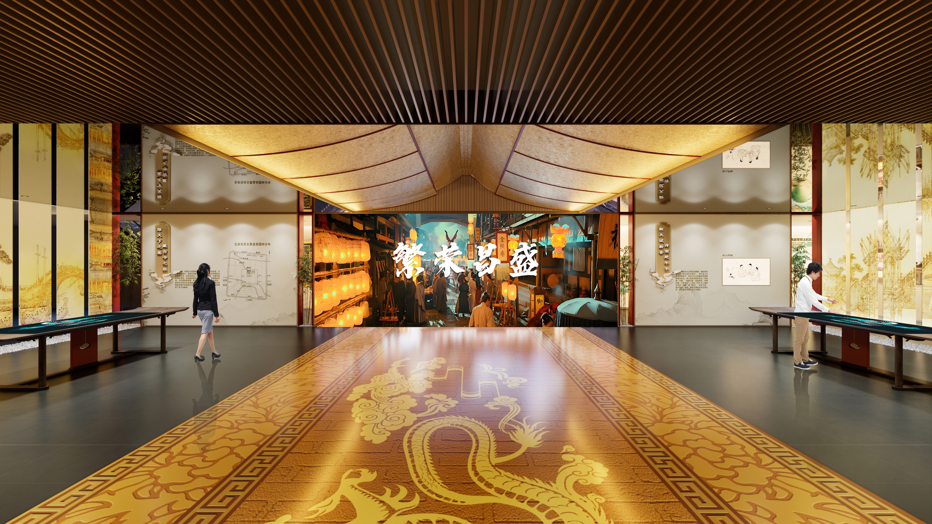 “太平盛世”以贯通天下的汴河漕运为叙事起点,生动展现北宋经济繁荣与文化昌盛。展厅运用数字模拟、互动投影等科技手段,复原了北宋漕船往来、货物云集的繁忙景象。特别参照北宋《大驾卤簿图》,以沉浸式影院技术再现皇家出行的盛大仪仗,让观众身临其境感受“八方辐辏,万国咸通”的太平气象。